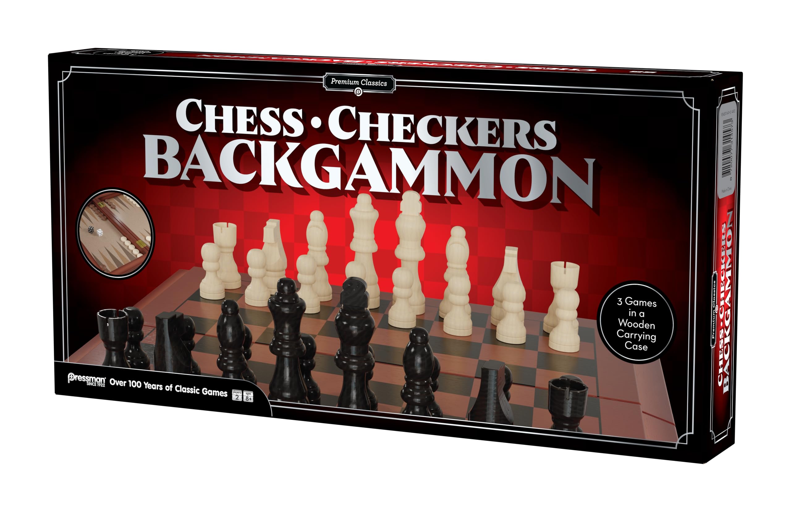 Pressman Premium Classics: Chess, Checkers, Backgammon | 3 Games in a Wooden Carrying Case | 2 Players, Ages 8+—